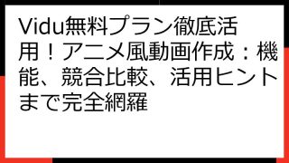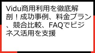 Vidu商用利用の完全ガイド:費用、事例、競合比較で徹底解剖! 動画生成AIツール「Vidu」の商用利用について、徹底的に解説します。 Viduは、高品質なアニメ風動画を手軽に作成できることで注目を集めていますが、商用利用となると、費用、著...