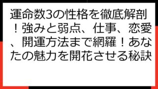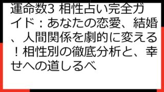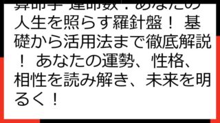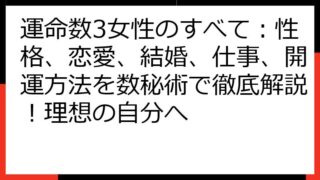 数秘術の奥義:運命数・宿命数から読み解くあなたの魂の羅針盤 数秘術の世界へようこそ! この記事では、あなたの生年月日や名前から導き出される数字を通して、自己理解を深め、より豊かな人生を送るためのヒントをお届けします。 数秘術は、古代から伝わ...