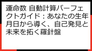 【完全版】運命数 自動計算ガイド:あなたの人生を紐解く秘伝の奥義 運命数に興味をお持ちのあなたへ、ようこそ! このガイドでは、あなたの生年月日から導き出される運命数について、徹底的に解説します。 運命数とは何か、どのように計算するのか、そし...