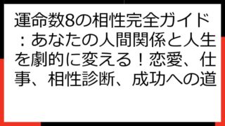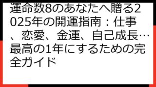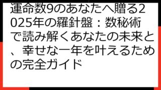 運命数9が示す2025年の羅針盤:個人の成長と社会への貢献 2025年、運命数9を持つあなたにとって、どんな一年になるのでしょうか? この記事では、数秘術の視点から、運命数9の基本的な特性、2025年のテーマ、そして、最大限に力を発揮するた...