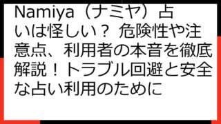 Namiya(ナミヤ)占いは当たる?徹底検証!口コミ・評判から紐解く的中率の秘密 Namiya(ナミヤ)占いに興味をお持ちのあなたへ、この記事では、その実力と真実に迫ります。 「当たる」「当たらない」という二つの側面から、口コミや評判を徹底...
