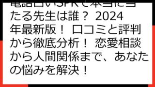 【2025年最新】電話占いSPRの料金完全ガイド!無料特典から当たる先生まで徹底解説! 電話占いSPRに興味をお持ちのあなたへ、この記事では、SPRの料金体系から、お得な無料特典、そして「当たる」と評判の先生たちまで、徹底的に解説します。 ...
