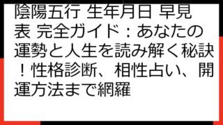 陰陽五行 陰陽五行 生年月日 早見表 完全ガイド:あなたの運勢と人生を読み解く秘訣!性格診断、相性占い、開運方法まで網羅 【陰陽五行 生年月日 早見表 完全版】あなたの生まれ持った性質と運勢を読み解く 陰陽五行と生年月日を組み合わせた早見表は、あなたの生まれ持った性質や運勢を読み解くための強力なツールです。 この記事では、その早見表を最大限に活用し、自己理解を... 2025.09.06 陰陽五行