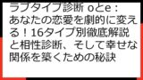 - アプローチ方法:相手に効果的なアプローチ方法が分かります。 相手のタイプに合わせたコミュニケーション術を学ぶことで、恋愛を成功に導く可能性を高めることができます。