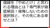 この記事では、女性が復縁を成功させるために必要な心構え、具体的なアプローチ方法、そして長期的な関係構築の秘訣を、専門的な視点から徹底解説します。