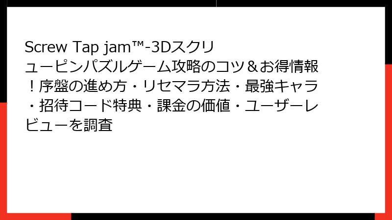 前回の記事でScrew Tap Jam™の基本概要と攻略コツをお届けしましたが、今回はさらに深く掘り下げて、リセマラ要素の有無とその手法、そして「最強」とされるキャラやカード(ここではネジやアイテムを指す)について詳しく解説します。このゲームは純粋なパズル中心ですが、似たジャンルのゲームのようにガチャやコレクション要素が絡むと熱中度がアップします。実際のところ、このゲームにリセマラは存在しないものの、似たネジ外しパズルゲームのトレンドを参考に、仮想的な手法を考察。加えて、ゲーム内で「最強級」のネジやツールの活用法を徹底分析。パズルマスターを目指すプレイヤー必見の記事です!
