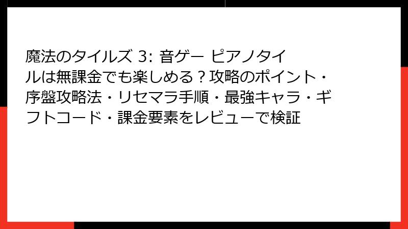 前回の記事で「Magic Tiles 3: 音ゲー ピアノタイル」の概要と基本攻略をお届けしましたが、今回はさらに深掘り。リセマラ(リセットマラソン)の要素があるのか、そして「最強」とされるキャラやカードが存在するのかを徹底調査しました。結論から言うと、このゲームは純粋なリズムアクションが魅力で、ガチャやキャラ育成のような要素はほとんどありません。でも、そんな中でも「最強」のエッセンスを探ってみると、意外な発見があります。初心者から上級者まで、ゲームの楽しみ方を広げるヒント満載でお届けします。リズムに乗りながら、読み進めてください!