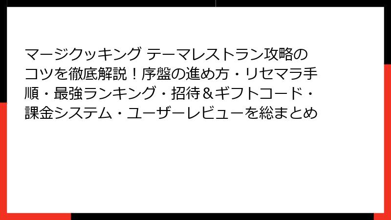 「マージクッキング テーマレストラン」はリセマラ不要の優等生ですが、知る人ぞ知る手法でさらに輝きます。最強カードを味方に、世界のキッチンを制覇しましょう。ポイ活成功率もアップ間違いなし! 次回はイベント特化攻略をお届け。皆さんのシェフ体験をコメントでシェアしてください。Bon Appétit!