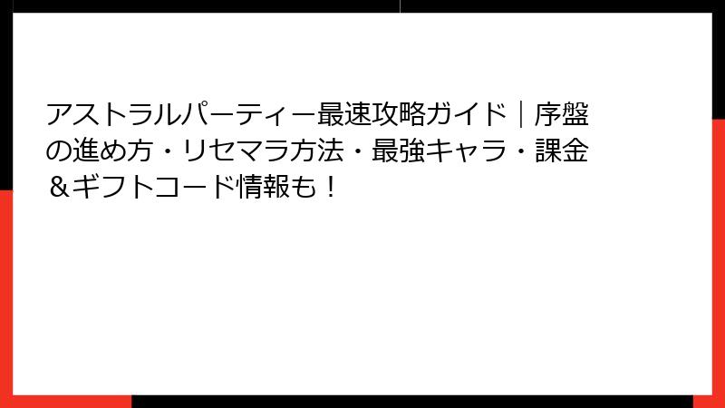こんにちは、ゲーム攻略ライターのガロウです! 『アストラル☆パーティー』(以下、アスパ)は、2025年5月20日にリリースされたスマホ向けパーティーゲームで、運と戦略が織り交ざるカオスなマルチプレイが魅力です。このゲームにはリセマラ(リセットマラソン)要素があり、序盤の強さを左右するキャラクターやカードを効率良く入手することが可能です。今回は、リセマラの具体的な手法と、2025年10月時点の「最強」とされるキャラ・カードを徹底解説! 初心者から上級者まで役立つ情報を、ブログ形式でたっぷりお届けします。