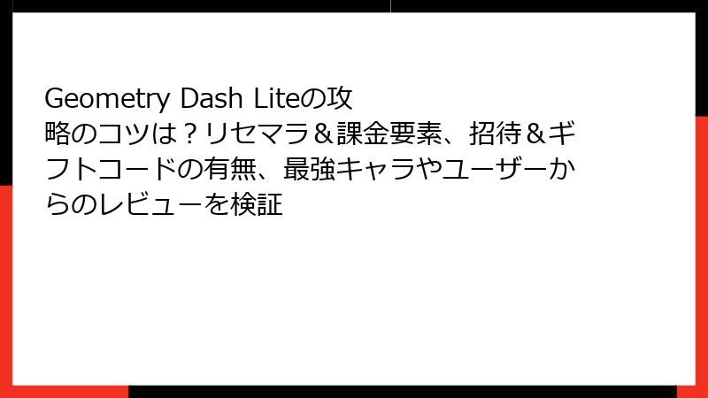 こんにちは、ゲーム好きの皆さん! 今日の記事では、人気スマホアプリ「Geometry Dash Lite」を徹底的に掘り下げてみます。このゲームは、シンプルな操作で心を鷲掴みにされるリズムアクションの傑作。ダウンロード数は数億を超え、世界中のプレイヤーを魅了し続けています。基本無料で広告ありのライト版ですが、本格的な楽しさが詰まっています。初心者の方もベテランも必見! ゲームの概要から攻略のコツ、序盤の進め方まで、詳しく解説していきます。さあ、スクロールを飛ばして飛び込みましょう!