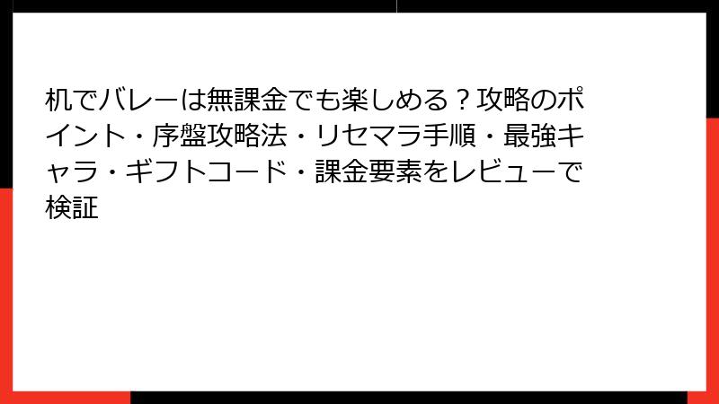 みなさん、こんにちは! 前回のレビューで「机でバレー」の基本をお届けしましたが、今回はさらに深掘り。リセマラ要素の有無から、その手法、そして「最強」と噂される選手やカードについて徹底解説します。このカジュアルスポーツゲームは、ガチャやカード収集がメインではないものの、チーム強化の鍵となる要素が潜んでいます。無課金勢も課金勢も必見のTipsを、ブログ風に詳しくお伝えします。机の上バトルを極めましょう!