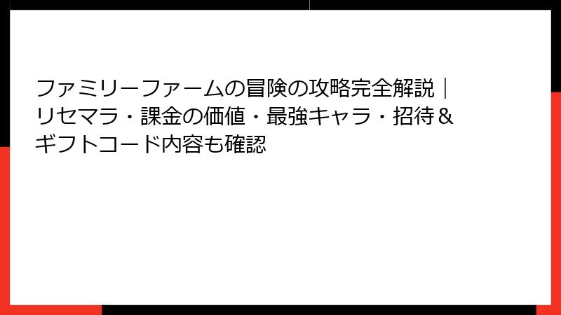 ファミリーファームの冒険の招待コード&ギフトコードは、無課金プレイの起爆剤。メリットを活かし注意点をクリアすれば、探検も農場経営もワンランクアップ間違いなし。今日から公式SNSをチェックして、最初のコードをゲット! 皆さんの農場エピソード、コメントで教えてくださいね。次回は最新ギフトコード特集をお届け予定。冒険の風に恵まれますように♪