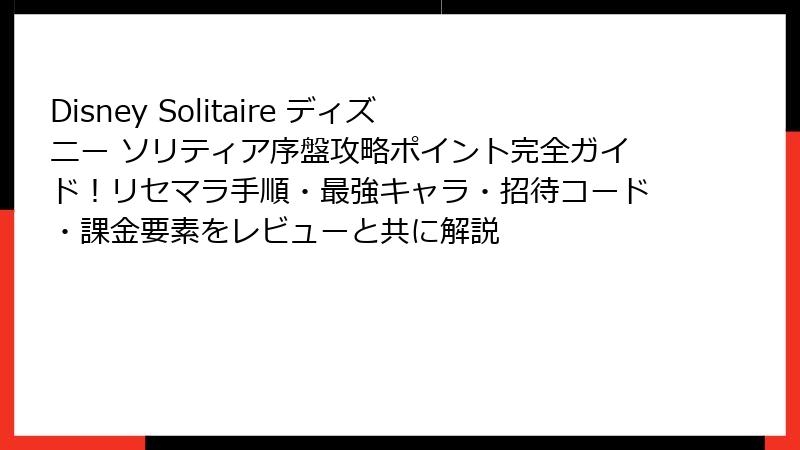 ディズニーソリティア(Disney Solitaire)は、魅力的なディズニーキャラクターと戦略的なソリティアが融合したスマホアプリですが、ガチャ要素が加わることでさらに奥深みが増しています。この記事では、ゲームにリセマラの仕組みが存在することを前提に、その具体的な手法をステップバイステップで詳しく解説します。また、「最強」と評されるキャラやカードについても、評価基準や活用法を深掘り。リセマラを活用すれば、序盤の苦戦を回避し、ディズニーの魔法のような世界をスムーズに楽しめます。ガチャ運に左右されやすいゲームですが、賢い選択であなたもソリティアのマスターになれるはずです!