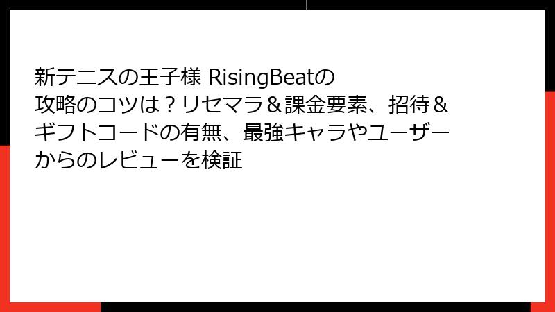 『新テニスの王子様 RisingBeat』(テニラビ)の醍醐味は、テニプリキャラたちの熱いリズムバトル! サービス終了後もファンの間で語り継がれるリセマラの醍醐味と、最強キャラカードの編成術を深掘りします。本記事では、リセマラの詳細手法から狙い目カード、最強オーダーの構築までをブログ形式で徹底ガイド。無課金勢でも最速で強くなるための知識を網羅しました。ビートを刻む準備はいいですか? さあ、スタートダッシュを決めましょう!