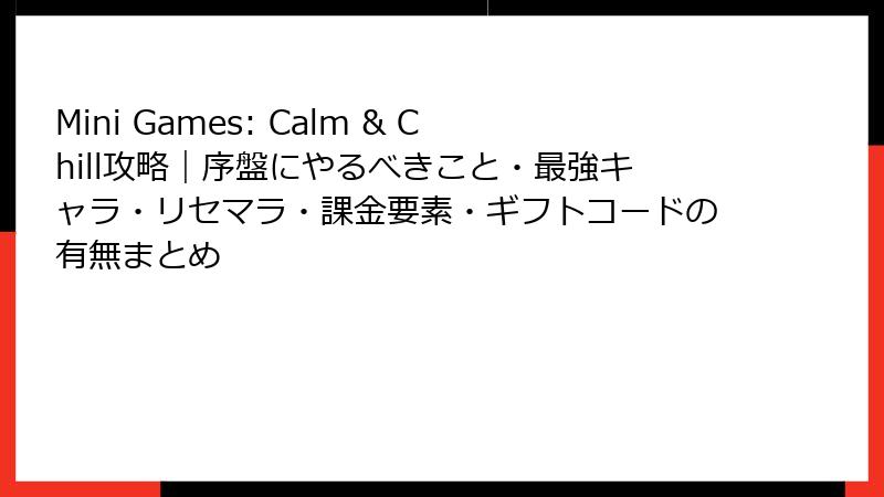前回の攻略ガイドで大好評の「Mini Games: Calm & Chill」。リラックスミニゲームの代表格ですが、ガチャやリセマラが気になるところですよね?この記事では、アプリのシステムを深掘りし、リセマラの有無、最強キャラ(もし存在したら)の詳細を検証。カジュアルゲームの純粋な楽しみ方を守りつつ、効率的な進め方を提案します!