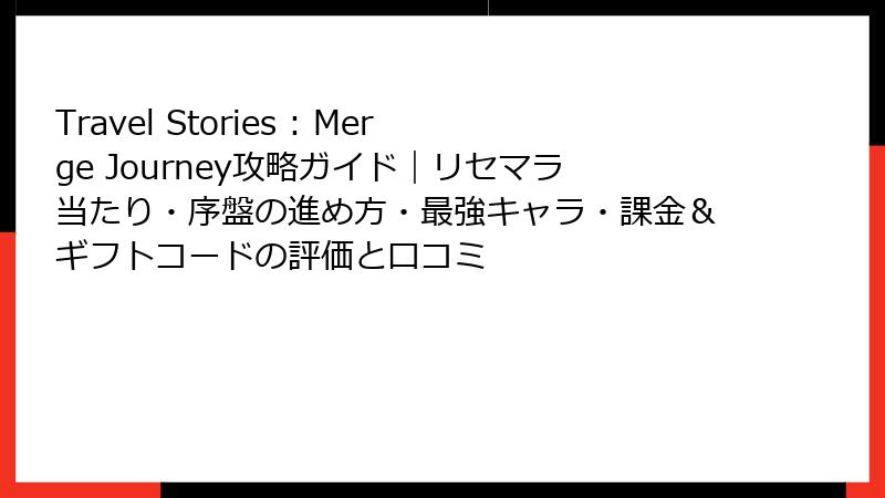 マージパズルゲーム「Travel Stories: Merge Journey」で気になるリセマラ(リセットマラソン)と最強キャラ・アイテムについて徹底調査!ガチャなしのシンプル設計が魅力ですが、だからこそ序盤のスタートが重要。リセマラは不要ですが、「最強」と呼ばれる効率アイテムを活用した戦略でレベル爆上げを実現しましょう。この記事では、リセマラの有無から代替手法、最強アイテムのTierリスト、活用コツまでをブログ風に詳しく解説。ポイ活勢も必見です!