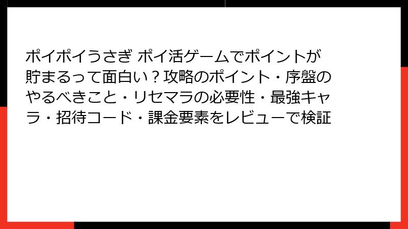 ポイポイうさぎの熱いプレイヤー諸君! 前回の基本攻略でタップの快感を味わったあなたなら、きっと「もっと効率を上げたい!」と思っているはず。今回は、リセマラ要素の有無から最強うさぎの選定基準まで、徹底的に掘り下げます。放置系ポイ活ゲームの性質上、ガチャやランダム要素は薄めですが、レベルアップで解放される「新うさぎ」に微妙な性能差あり! これを活かした「擬似リセマラ」手法で、スタートダッシュを決めましょう。データとプレイヤーレビューを基に、ブログ形式で読みやすくまとめました。