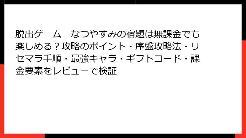 夏のノスタルジックな脱出ゲーム『脱出ゲーム なつやすみの宿題』。前回の攻略ガイドに続き、今回はリセマラ要素や最強キャラ・カードの有無を深掘り! ガチャなしの純粋な謎解き体験が魅力のこのアプリで、初心者から上級者までが平等に楽しめる理由を詳しくお届けします。