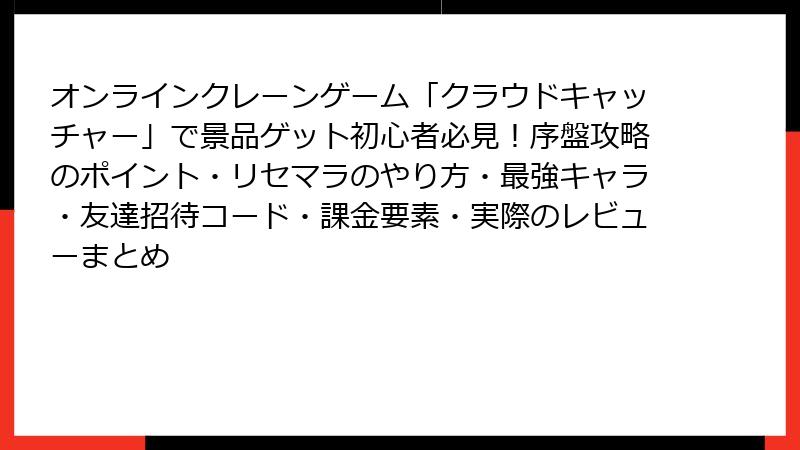 オンラインクレーンゲームの定番「クラウドキャッチャー」で、憧れのフィギュアやぬいぐるみを自宅にゲットしましょう! 初心者から上級者まで楽しめるこのアプリの概要から、序盤の立ち回り、攻略コツまで、ブログ形式で詳しく解説します。10周年を迎えた老舗サービスとして、豊富な景品ラインナップとユーザー目線の機能が魅力です。