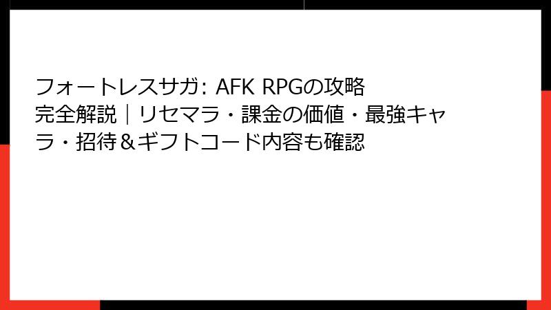 フォートレスサガ: AFK RPGは放置系RPGながら、序盤の英雄編成が進行速度を大きく左右します。リセマラは必須級で、理想のレジェンド英雄1体以上を狙うのがおすすめ。所要時間は1回あたり10〜15分と短く、無課金でも回しやすい仕様です。PU(ピックアップ)キャラ狙いなら3-12クリアまで進めて20分追加。
