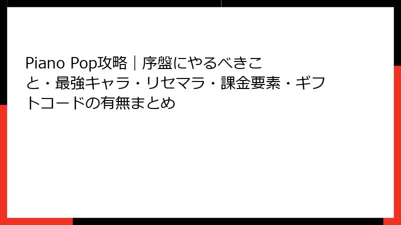 Piano Popは、音楽とリズムを楽しみながらタップ操作で楽曲を演奏するスマホゲームアプリですが、ガチャやリセマラ要素が存在するかどうかは、ゲームの進行やリソース管理において重要なポイントです。この記事では、Piano Popにリセマラ要素がある場合の具体的な手法と、もし「最強」とされるキャラクターやカードが存在する場合の詳細を解説します。リセマラの効率的な進め方や、初心者が知っておくべき最強キャラ・カードの特徴、序盤の戦略まで、ブログ記事形式で詳しくお届けします。Piano Popを始めたばかりの方や、効率的に強力なスタートを切りたい方にとって役立つ情報が満載です!