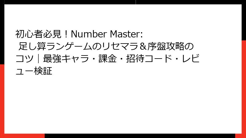 「Number Master: 足し算ランゲーム」は、足し算とランゲームを融合させた中毒性の高いスマホゲームアプリです。シンプルな操作性と戦略性が魅力ですが、リセマラ(リセットマラソン)要素や「最強」とされるキャラクターやカードが存在するのか、気になるプレイヤーも多いでしょう。この記事では、ゲームにリセマラ要素がある場合の手法を詳しく解説し、もし「最強」のキャラやカードが存在する場合、それらの特徴や活用方法を徹底的に紹介します。初心者から上級者まで、ゲームを最大限に楽しむための情報をお届けします!