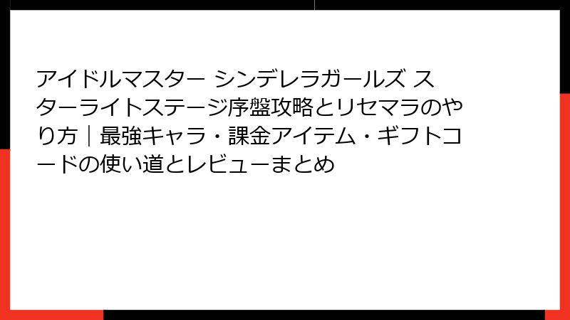 アイドルマスター シンデレラガールズ スターライトステージ(デレステ)は、サービス継続中ながら新規コンテンツ追加が終了した今も、リセマラで強いスタートを切れます。リセマラはプラチナオーディションの無料ガチャが鍵で、無課金でもSSRを狙えます。一方、最強キャラはハイスコア編成(MASTER+中心)で決まり、レゾナンスやドミナント特技持ちが環境を支配。初心者から上級者まで、このガイドでトップを目指しましょう!