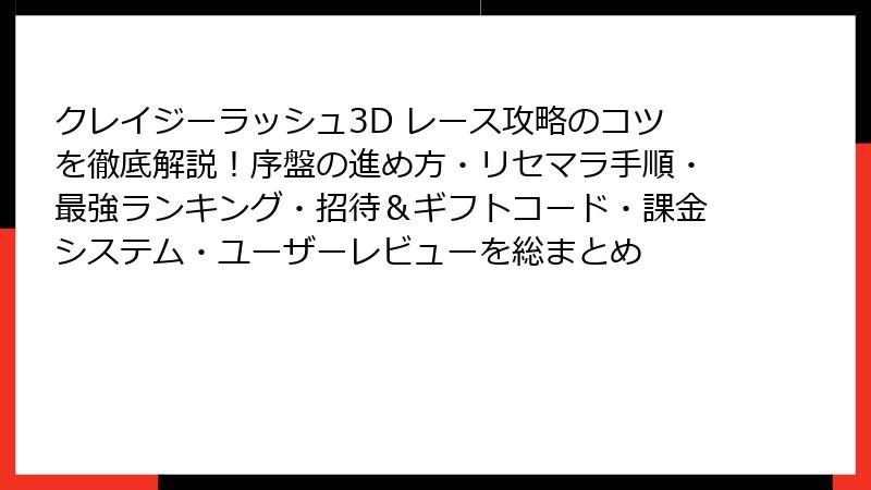 ド派手なクラッシュとスタントが魅力の「クレイジーラッシュ3D レース」。このハイパーカジュアルレーシングゲームにガチャやリセマラ要素はあるのか?最強の車種やビルドはどう作るのか?本記事で徹底解剖!リセマラ不要で無課金でもトップを目指せる理由から、序盤の効率的な進め方、最強仕様の作り方までを詳しく解説します。レースの頂点に立つための必須知識を今すぐゲット!