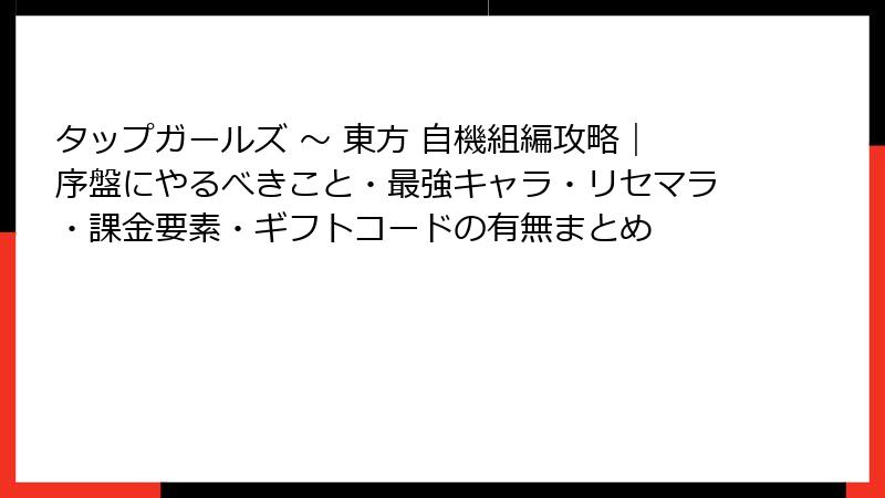 東方Projectの自機キャラをタップで攻略する中毒性バトルゲーム「タップガールズ ~ 東方 自機組編」。ガチャやリセマラが気になるところですが、結論から言うとリセマラ要素は一切ありません! 固定キャラを順番にクリアしていくシンプル設計が魅力。今回はその理由と代替強化法、そして「最強」ビルドやおすすめキャラについて徹底解説します。
