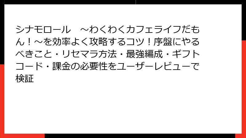 サービス終了した名作放置カフェゲーム『シナモロール ~わくわくカフェライフだもん!~』(通称:カフェシナ)。シナモンたちの可愛い衣装や家具をガチャで集めて売上ボーナスを最大化するのが醍醐味!リセマラは必須ではないけど、序盤から強力ブーストを狙うなら有効。手法から最強アイテムまで、攻略wikiやプレイヤー情報を基に徹底解説します。