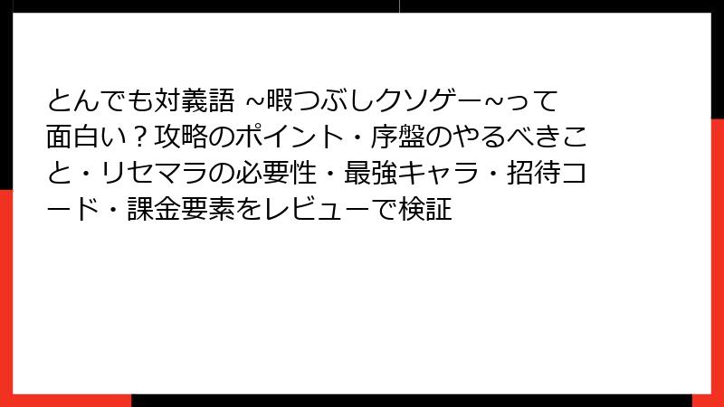 前回の攻略ガイドに続き、みんなが気になる「リセマラ」と「最強キャラ」について深掘り! でもこのクソゲー、ガチャもキャラも存在しない超シンプル設計。無課金で即全クリ可能なんですよ。リセマラなんて時間の無駄! 代わりにその真相と、効率的な進め方をブログ風に徹底解説します。