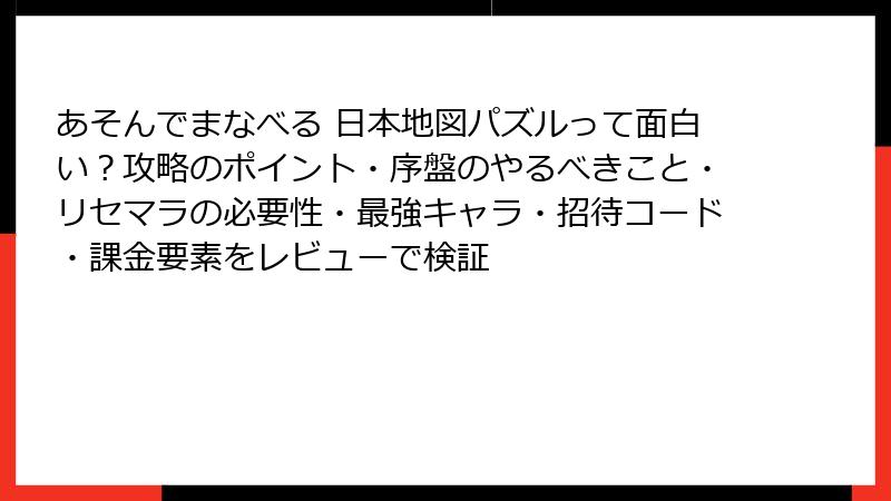 教育パズルゲームの金字塔「あそんでまなべる 日本地図パズル」。前回の攻略ガイドに続き、今回はリセマラ要素や最強キャラについて徹底調査! ガチャ依存のソシャゲとは一線を画すシンプル設計が魅力ですが、果たしてリセマラは可能なのか? 最強キャラが存在するのか? 800万DL超のロングセラーアプリの真相を、公式情報とユーザー体験から深掘りします。