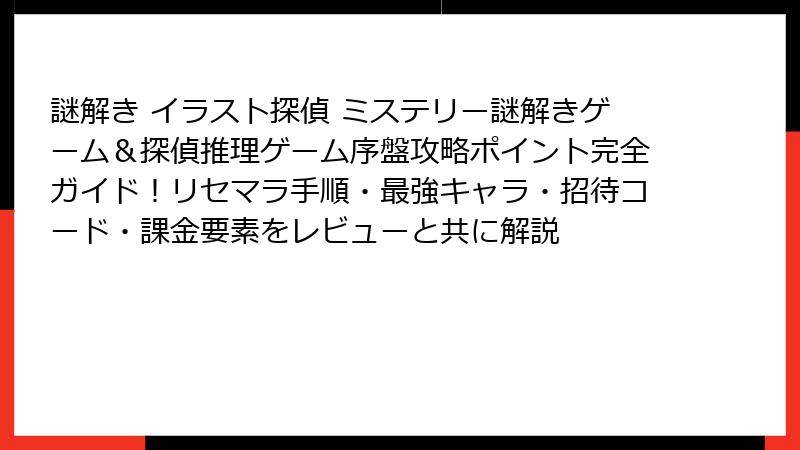 前回の攻略ガイドに続き、「イラスト探偵」アプリのリセマラ要素や最強キャラについて徹底解説!このゲームはガチャやカード育成がなく、純粋な観察力と推理力が勝負を決める爽快ミステリー。リセマラ不要で即スタート可能、無課金でも全ステージ制覇が夢じゃない!