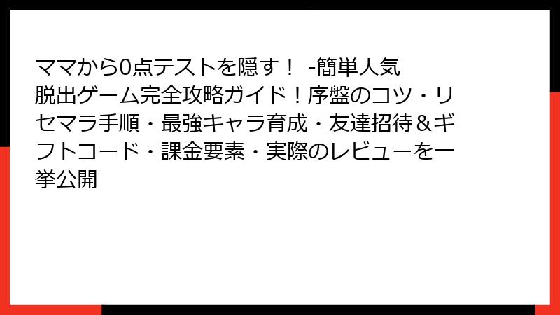 大人気脱出ゲーム「ママから0点テストを隠す!」は、0点テストをママの目から逃れさせるユーモアたっぷりのステージ制アプリ。Eureka Studioのヒット作として、数百万ダウンロードを誇りますが、ガチャやリセマラを期待するプレイヤーもいるはず。そこで本記事では、リセマラ要素の有無と手法、最強キャラやカードの存在を徹底検証。結論から言うと、このゲームは「純粋なパズル脱出」なので、そうした要素は一切なし! その理由とメリットを詳しく解説します。