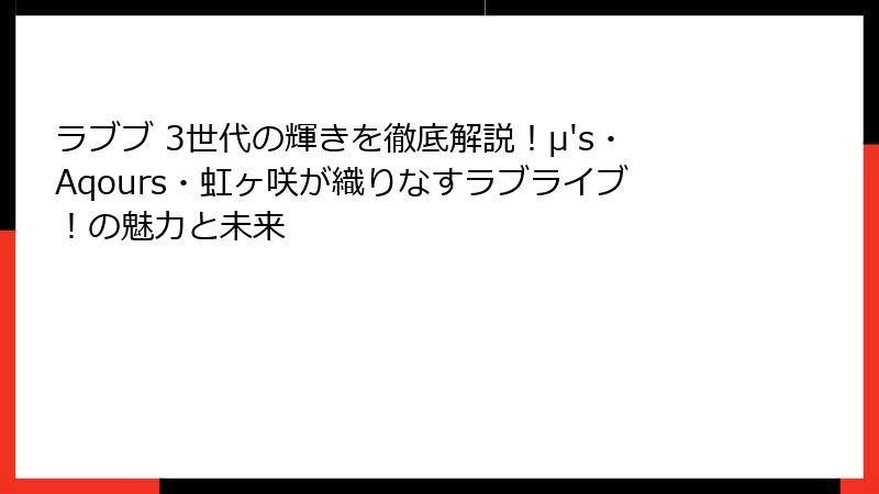 「ラブブ」という愛称で親しまれるこのシリーズは、μ’s(ミューズ)、Aqours(アクア)、虹ヶ咲学園スクールアイドル同好会という3つの世代を中心に展開し、それぞれが独自のストーリー、音楽、キャラクターで愛されています。