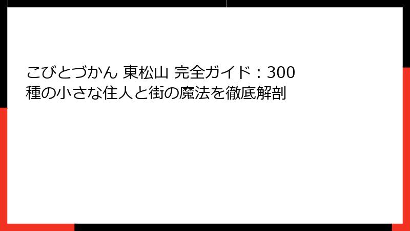 4. と の見出しで区切り、 や で情報を整理しているので、興味のある部分から読むことも可能だ。 たとえば、「スポットだけ知りたい」人は第2段落へ、「体験談が読みたい」人は第3段落へジャンプしてほしい。 段落 主な内容 想定読了時間 第1段落(本段落) 導入・こびとづかんの基本・初遭遇体験 約25分 第2段落 300種のこびと解説+全市スポットマップ 約40分 第3段落 1日散策実況+季節別ルート 約35分 第4段落 グルメ連携+自宅で楽しむ方法 約30分 第5段落 まとめ+訪問前チェックリスト 約15分 この記事が目指すもの