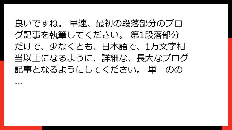 良いですね。 早速、最初の段落部分のブログ記事を執筆してください。 第1段落部分だけで、少なくとも、日本語で、1万文字相当以上になるように、詳細な、長大なブログ記事となるようにしてください。 単一のの…