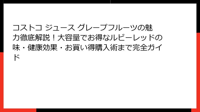 の見出しタグから始めて、ブログ記事形式で出力して下さい。 複数の タグを使用して、読み応えがあるように。 また、それぞれの タグの中に、複数の タグが、入れ子で含まれるように。 全て、HTMLで出力。 や などの箇条書きのHTMLタグや、tableタグも使用してOK。 ただし、リンクやURLは、絶対に、挿入しない。 私宛の報告や、私宛の解説や、私宛の説明の文章は、一切、不要です。 ブログ記事部分だけ、生成・出力して下さい。 カークランドシグネチャー ルビーレッドグレープフルーツジュースのスペックを詳しく解説!成分・容量・栄養価まで