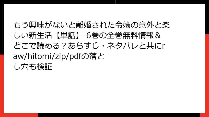 以上が「もう興味がないと離婚された令嬢の意外と楽しい新生活【単話】」第6巻のあらすじと見どころです。ヴェラの新たな生活とアランとの関係がどのように進展していくのか、次巻も見逃せません!