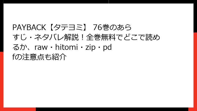 「PAYBACK【タテヨミ】」は人気作品のため、raw、hitomi、zip、pdf、漫画バンクなどの海賊版サイトで違法に配信されている場合があります。しかし、これらのサイトの利用は以下のようなリスクを伴います。