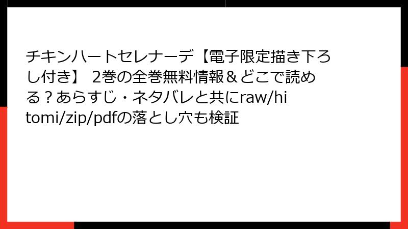 raw/hitomi/zip/pdf/漫画バンクなどの海賊版サイトで『チキンハートセレナーデ【電子限定描き下ろし付き】』2巻を読むのは、法的罰、個人情報漏洩、業界衰退のリスクを伴う愚策です。無料の代償は高く、結果的に自分自身や好きな作品を傷つけることになります。代わりに、公式サービスして高品質な体験を。クリエイターの努力を尊重し、持続可能な漫画文化を支えましょう。安全第一で、心から楽しめる読書を続けていきましょう。