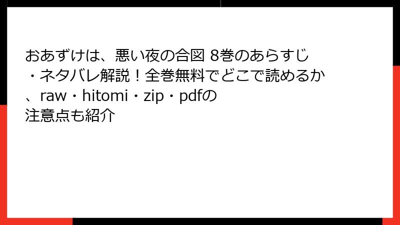 『おあずけは、悪い夜の合図』は、優木なちによる人気の恋愛漫画で、情熱的なストーリーと魅力的なキャラクターが多くのファンを惹きつけています。しかし、この作品をraw、hitomi、zip、pdf、漫画バンクなどの海賊版サイトで読むことは、さまざまなリスクを伴います。この記事では、海賊版サイトを利用することの危険性を詳細に解説し、なぜ合法的な方法で漫画を楽しむべきかを明らかにします。法的、倫理的、技術的な観点から、リスクを深掘りしていきます。