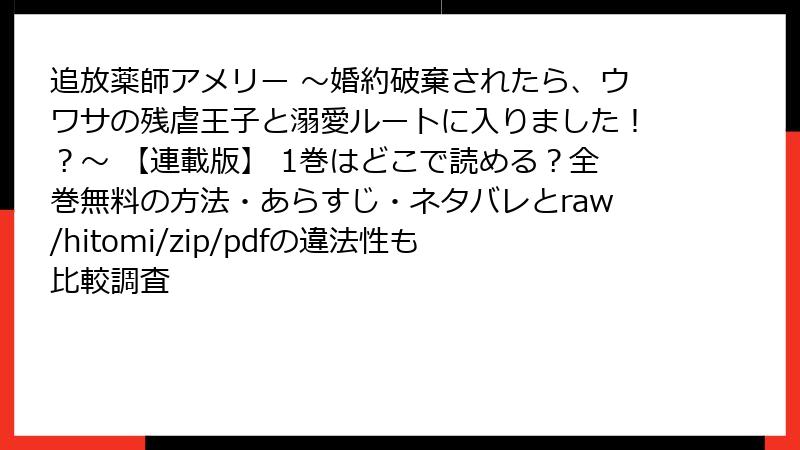 『追放薬師アメリー ~婚約破棄されたら、ウワサの残虐王子と溺愛ルートに入りました!?~』は、末松樹(原作)と、はんそで(作画)による魅力的なファンタジーロマンス漫画です。しかし、この作品をraw、hitomi、zip、pdf、漫画バンクなどの海賊版サイトで読むことは、重大なリスクを伴います。この賊版サイトを利用することの危険性を、法的、倫理的、技術的な観点から詳しく解説します。以下、ブログ形式でそのリスクを掘り下げ、なぜ正規のプラットフォームで読むべきかを説明します。