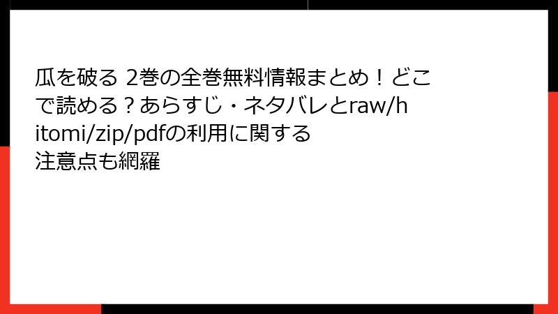 raw、hitomi、zip、pdf、漫画バンクなどの海賊版サイトは、法的・セキュリティ・プライバシー・経済的なリスクが満載です。一時の便利さを優先すると、後々のトラブルが待っています。『瓜を破る』2巻の深いテーマを、心置きなく味わうなら、正規の電子書籍サービス(例: 無料試し読みやキャンペーン活用)を選びましょう。2025年現在、合法サイトのクーポンやアプリが充実しており、結果的に満足度も高まります。リスクを避け、作者を応援する読書習慣を身につけましょう!