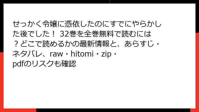 『せっかく令嬢に憑依したのにすでにやらかした後でした!』は、沢野いずみによる人気の異世界転生ファンタジーラブコメ漫画で、悪役令嬢クリスティナの逆転劇が魅力の作品です。しかし、このような人気作品を、raw、hitomi、zip、pdf、漫画バンクなどの海賊版サイトで読むことは、重大なリスクを伴います。海賊版サイトは無許可で漫画を公開する違法なプラットフォームであり、利用することで法的、倫理的、技術的な問題に直面する可能性があります。本記事では、これらのリスクを詳細に解説し、なぜ正規のプラットフォームを選ぶべきかを説明します。以下、読み応えのある形で、具体的な危険性を掘り下げます。