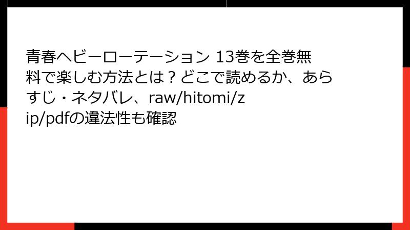 rawや漫画バンクなどの海賊版サイトは、法的・セキュリティ・健康・経済的リスクの塊。利用は一時的な快楽の代わりに、長期的な損失を招きます。『青春ヘビーローテーション』のような名作は、作者の努力を尊重して正しく読むのがファンとして当然です。リスクを避け、業界を支える選択を! あなたの感想や体験談、コメントでシェアしてくださいね。