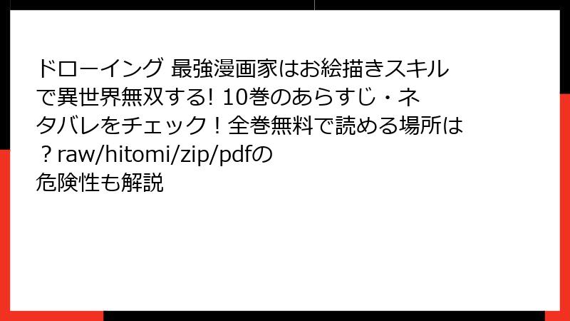 『ドローイング 最強漫画家はお絵描きスキルで異世界無双する!』の10巻は、物語の大きな転換点を迎える巻としてファンの間で話題沸騰中です。主人公アキラのチート能力がさらに輝き、仲間たちとの絆が試される展開が満載。今回は、ネタバレ満載で10巻の詳細な内容を掘り下げます! まだ読んでいない方は、ここでブラウザバックを推奨します。以下では、主要エピソードの核心に迫り、意外な展開や感動のシーンを余すところなくお届けします。ブログ風に、読みやすくまとめていきますよ!
