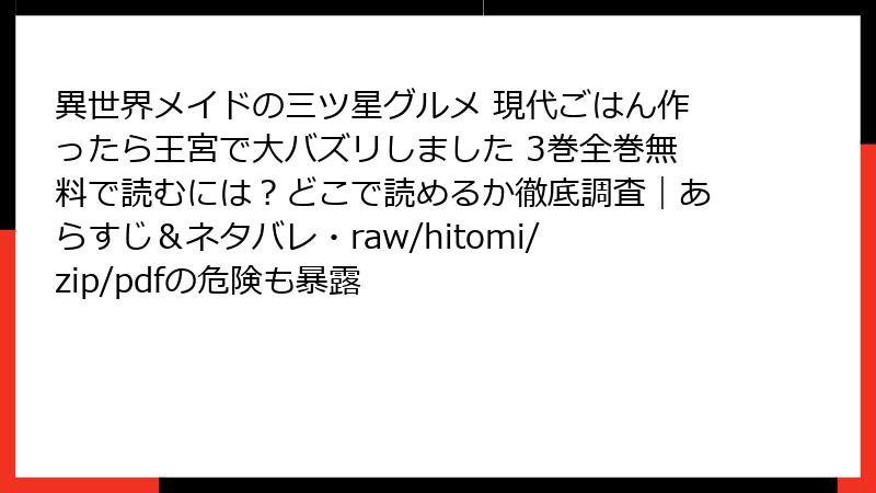こんにちは、漫画ファンでセキュリティ意識の高いブロガーです! 人気の異世界メイド漫画『異世界メイドの三ツ星グルメ 現代ごはん作ったら王宮で大バズリしました』のような作品を、raw、hitomi、zip、pdf、漫画バンクなどの海賊版サイトで読もうとする人は少なくありません。でも、待ってください! 無料で手軽に読めるように見えて、そこには深刻なリスクが潜んでいます。この記事では、そんな海賊版サイトの利用がもたらす法的・セキュリティ・経済的な危険性を、最新の事例やデータに基づいて詳しく掘り下げます。ネタバレなしで安心して読んでいただけるよう、ブログ風にまとめました。結局、正規ルートで楽しむのが一番安全ですよ!