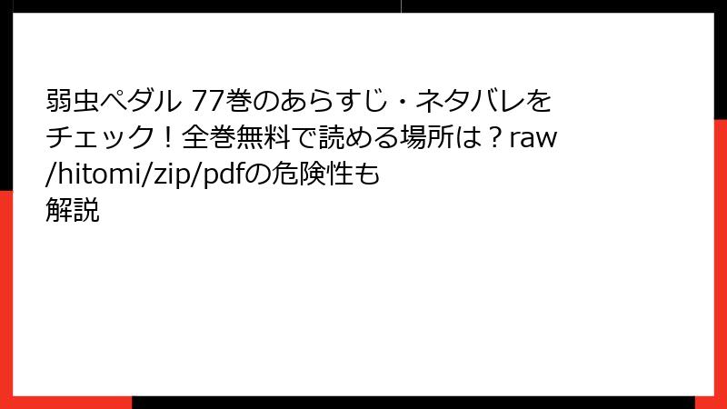 raw/hitomi/zip/pdf/漫画バンクなどの海賊版サイトは、法的罰金、ウイルス被害、倫理的後悔のトリプルパンチ。『弱虫ペダル』77巻の熱いレースのように、人生も正しいルートを選べば頂点に立てます。リスクを甘く見ず、正規ルートでサポートを! あなたの選択が、漫画業界の未来を照らす一筋の光になるはず。次回のブログもお楽しみに♪