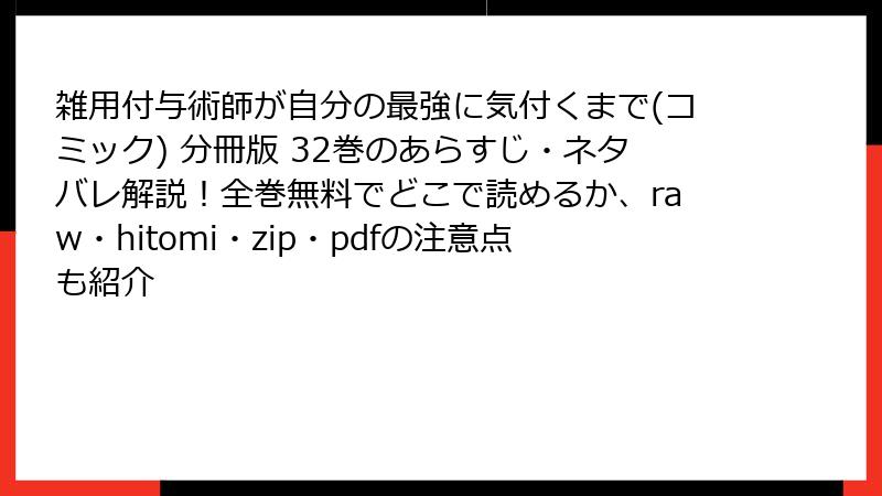 こんにちは、漫画ファンの皆さん! 前回のあらすじ紹介に続き、今回は『雑用付与術師が自分の最強に気付くまで(コミック) 分冊版』の32巻のネタバレ情報を、ガッツリ詳しくお届けします。この作品は、主人公ヴィムの成長と意外な強さが魅力のファンタジーですが、32巻では特に衝撃的な展開が満載。ネタバレ満載なので、未読の方はご注意を! ブログ形式で、複数のセクションに分けて読みやすくまとめました。物語の核心に迫る部分を、時系列やキャラクターごとに深掘りしていきます。分冊版特有の細かなエピソードも交えつつ、全体の流れを解説。さあ、ネタバレの渦に飛び込みましょう!